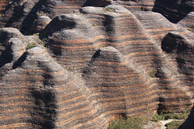 From the air, the Bungle Bungle range is an awesome site, rising 300 metres out of the plain. The orange and black stripes of these massive sandstone structures are breathtaking best seen from above in a scenic flight. As you sweep over the range, a hidden world of gorges and pools is revealed with fan palms clinging to walls and crevices in the rocks.